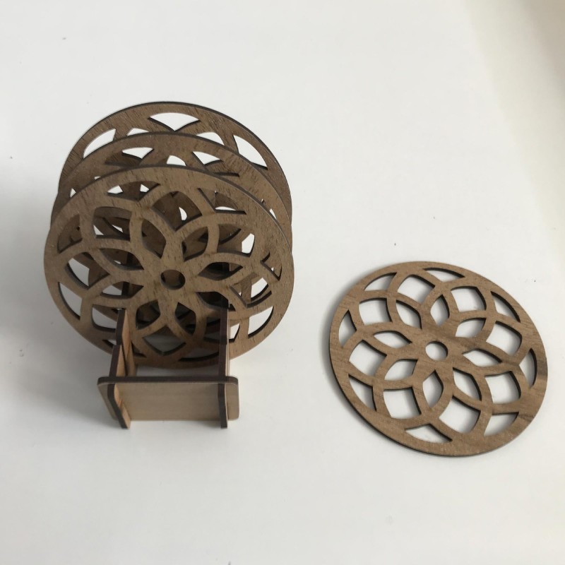 Bardak Altlığı T237, 3 mm MDF malzemeden lazer kesim yöntemiyle üretilmiş dekoratif ve işlevsel bir mutfak aksesuarıdır. Her bir altlık 10×10 cm ölçülerindedir; altlıklar, stand ile birlikte sunulur. Ürün, lazer kesim sırasında oluşabilecek hafif lekeler nedeniyle, deterjansız nemli bir bezle silindiğinde kolayca temizlenebilir.